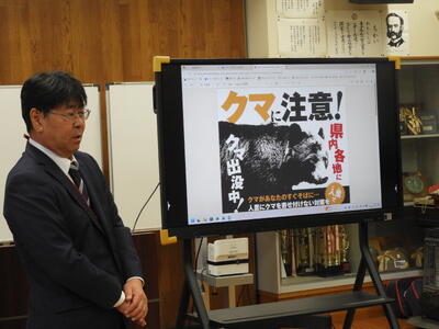 11月7日(金)全校朝会を行いました。校長先生から熊と出会った時の注意点をお話していただきました。