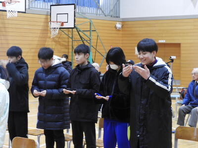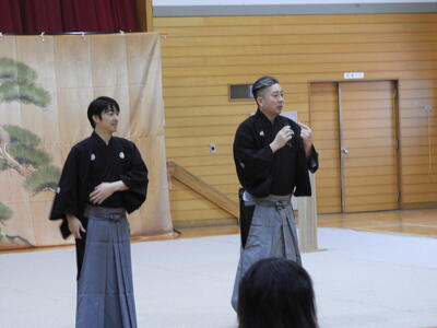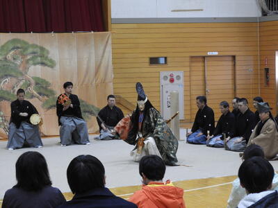 能・狂言教室 投稿: 副校長 (13:12) 1月28日(水)文化庁舞台芸術等総合支援事業(学校巡回公演)として、鎌倉能舞台の方をお招きして「能・狂言教室」を行いました。 「柿山伏」「敦盛」などを鑑賞したり、狂言を体験したりしました。大変貴重な経験となりました。